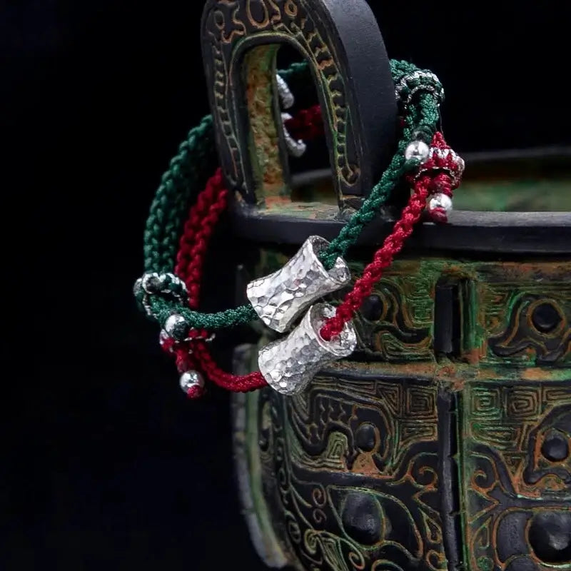 最高級の925シルバーで作られたこのカップル用「Lu Lu Tong(滑らかな道のチャーム)」ブレスレットは、ピーナッツ模様のデザインと、しっかりと編まれた赤と緑のコードが特徴です。シルバーは繊細な質感で酸化しにくく、コードは耐摩耗性と肌に優しいため、長時間快適に着用できます。